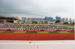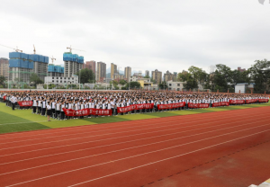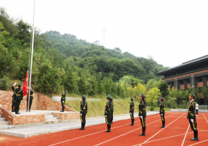 在雄壮的国歌声中,全体师生肃立,注视着五星红旗冉冉升起。