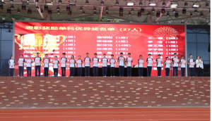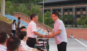 年级主任刘丹军宣读表彰名单,纪委书记王颖涛为获得物理类和历史类总分优异奖的同学颁奖,副校长武高鹏为获得班级优秀学生奖和班级进步奖的同学颁奖,党委书记许丹莉为获得单科优异奖的同学颁奖。