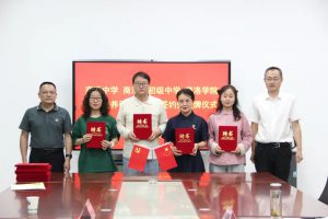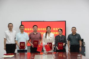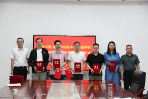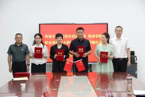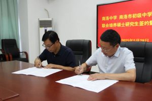 商洛学院数计学院院长李会荣与商洛中学傅先亮校长签约并授牌。数计学院副院长程国、人文学院副院长张建军向研究生培养导师颁发聘书。